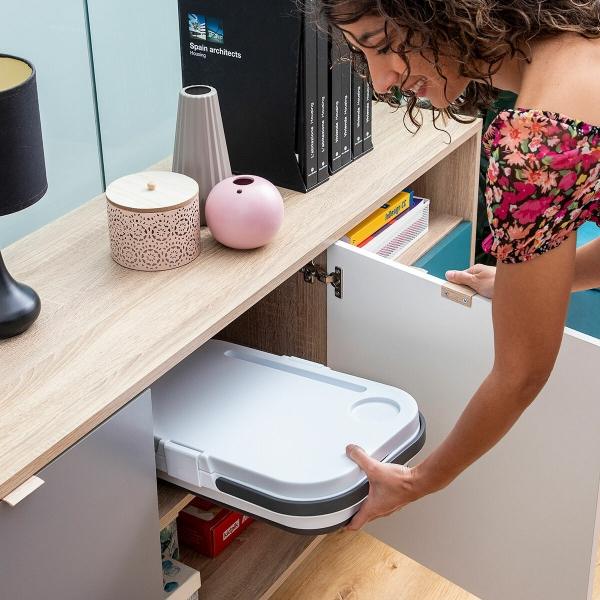 Šis sulankstomas iškylų krepšys su dangčiu-staliuku puikiai tinka mėgautis iškylomis lauke. Jis turi 2 rankenas, puodelio laikiklį ir lizdą mobiliajam telefonui ar planšetiniam kompiuteriui laikyti. Dangtį galima naudoti kaip padėklą arba išskleidus metalines kojeles paversti staliuku.